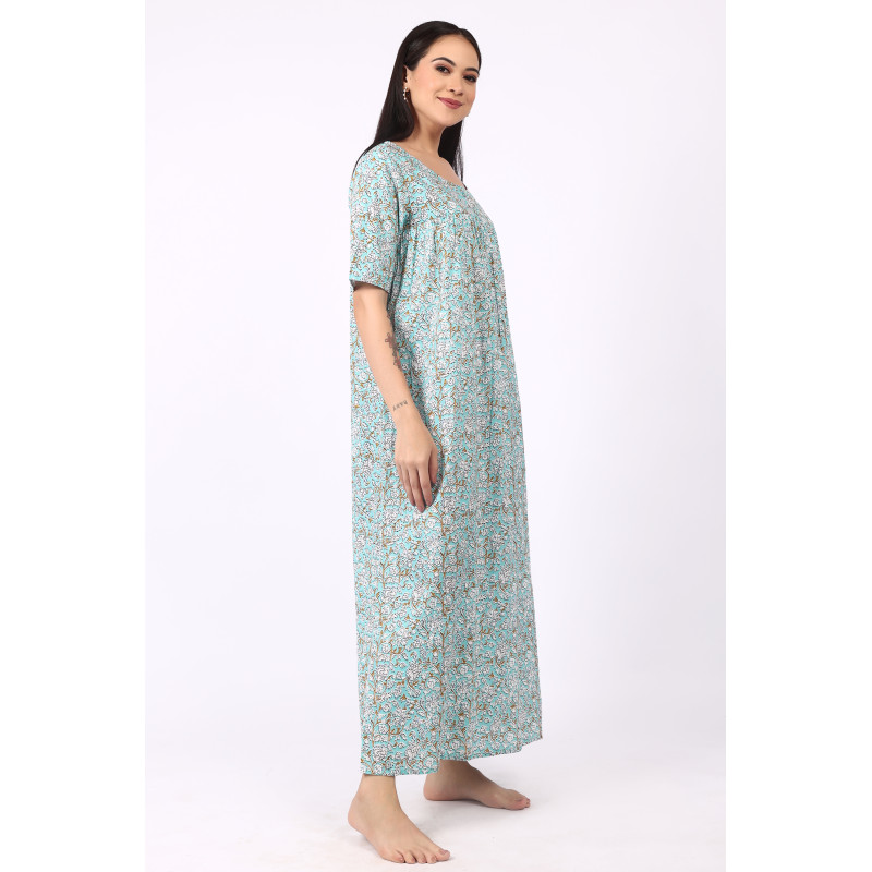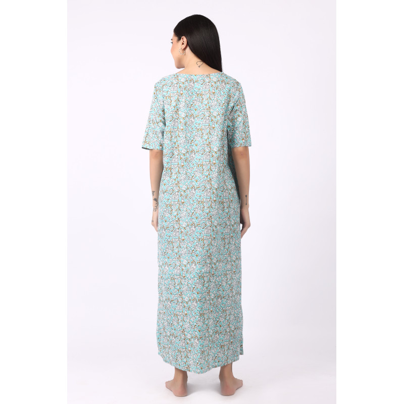 Stay cool and relaxed with this light blue printed cotton nighty for women. Designed in a maxi-length style, this night dress features an all-over floral vine print, short sleeves, and a round neckline, ensuring maximum comfort with a touch of elegance.