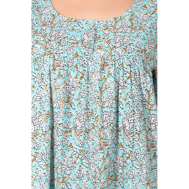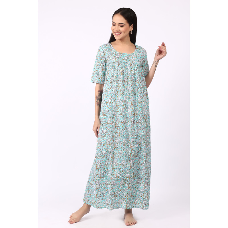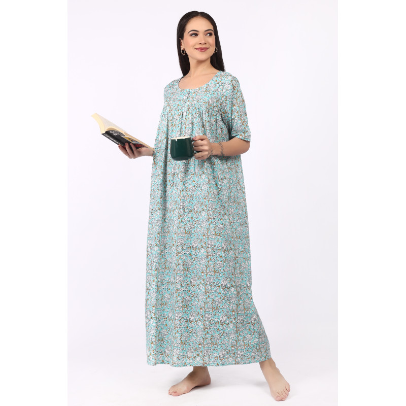 Light Blue Printed Cotton Nighty for Women – Comfortable Maxi Night Dress